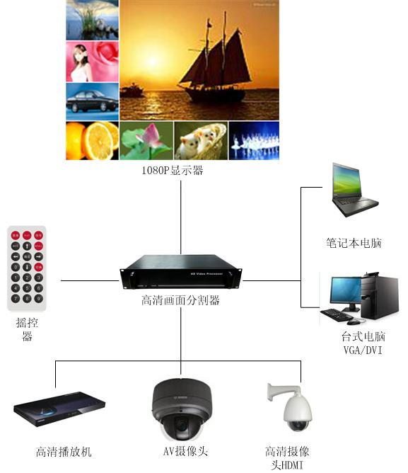 高清画面分割器是一款专业的视频处理与控制设备,它能够将多路高清/标清视频输入(VGA/DVI/HDMI/SDI/CVBS )以全屏显示或者多窗口的模式通过任意一个端口输出给显示设备,广泛适用于网络操作中心、公共控制中心、智能交通管理中心、处理中心、民用或军事监视系统、呼叫中心、金融中心、视频会议等。