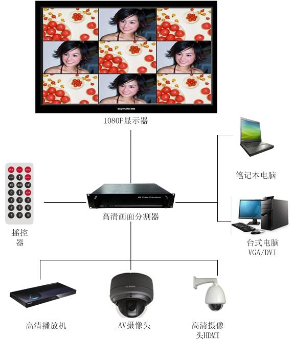 高清画面分割器是一款专业的视频处理与控制设备,它能够将多路高清/标清视频输入(VGA/DVI/HDMI/SDI/CVBS )以全屏显示或者多窗口的模式通过任意一个端口输出给显示设备,广泛适用于网络操作中心、公共控制中心、智能交通管理中心、处理中心、民用或军事监视系统、呼叫中心、金融中心、视频会议等。